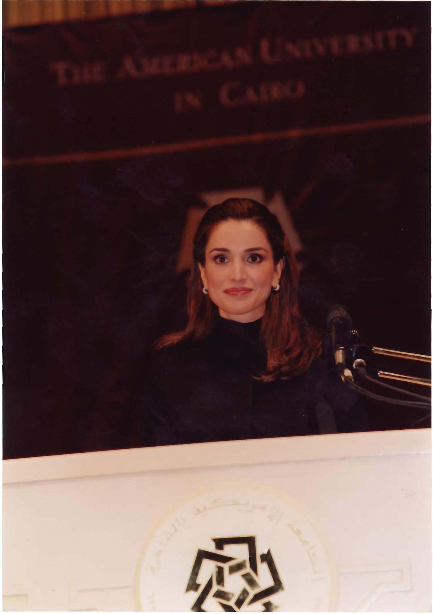 وأشارت جلالتها -التي كانت قد حصلت على درجة البكالوريوس في إدارة الأعمال وعلم النفس من الجامعة الأمريكية في القاهرة عام 1991- إلى ضرورة تجاوز المعوقات التقليدية للإنجاز والتعامل مع روح العصر من خلال الإبداع كما يفعل الأردن حيث يحمل أفكاراً وطموحات كبيرة رغم محدودية الموارد.