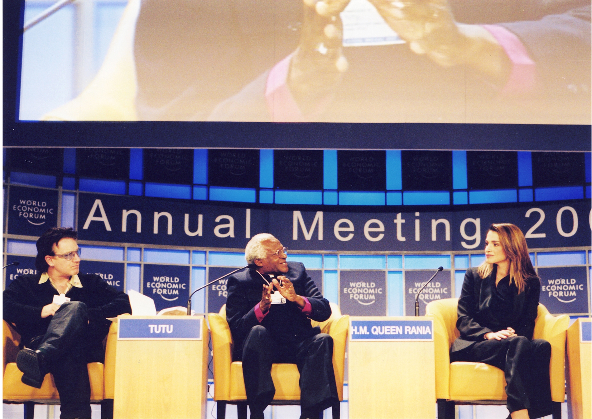 وقالت جلالتها: "أنا أؤمن أن لدى الولايات المتحدة فرصة جيدة لجعل العالم مكاناً أفضل". ومن المتحدثين في الجلسة الافتتاحية رئيسة الفليبين جلوريا ارويو وكبير أساقفة جنوب إفريقيا ديزمند توتو ووزير خارجية حكومة أفغانستان الانتقالية عبدالله عبدالله والبروفيسور ايلاي ويزل من جامعة بوسطن والمغني العالمي المشهور بونو المعروف بنشاطاته في مجال الجمعيات غير الحكومية ودعوته إلى رفع الديون عن الدول الفقيرة. وأدار الحلقة النقاشية شارلي روز مقدم برنامج "تشارلي روز" على محطة "بي بي اس" الأميركية حيث ركزت معظم الوقت على فرص الدول النامية في الحد من العنف والإرهاب حول العالم من خلال تجسير الفجوة بين العالمين الغني والفقير "من يملكون ولا يملكون".