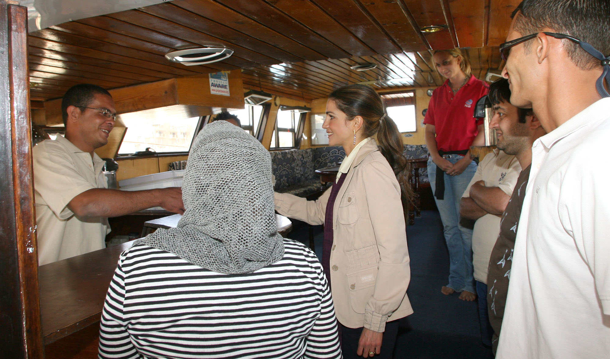 وفي نهاية الجولة زارت جلالتها إحدى قصص النجاح لسيدة من العقبة هي ليلى مناع الفائزة بجائزة تطوير العقبة للمشروعات الصغيرة عن مشروع قارب سياحي يقدم خدمات للجموعات السياحية وخاصة لذوي الاحتياجات الخاصة.