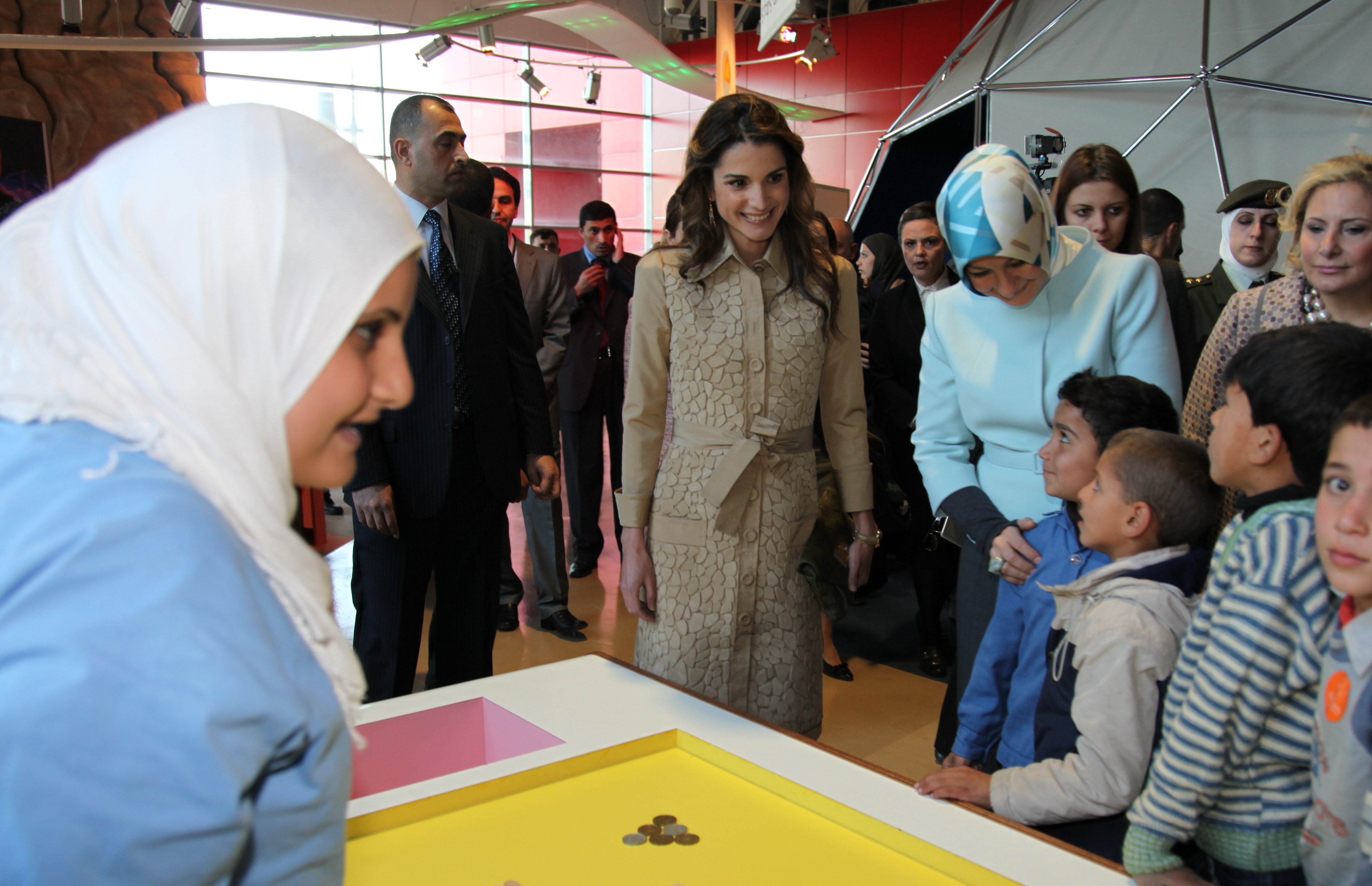 عمان - اصطحبت جلالة الملكة رانيا العبدالله زوجة الرئيس التركي "خير النساء" في جولة إلى متحف الأطفال لاطلاعها على البرامج التي يقدمها المتحف. ويعتبر المتحف من المبادرات التعليمية التي أطلقتها جلالة الملكة رانيا، وهو أول مؤسسة تفاعلية من نوعها في الأردن توفر مساحة للتعليم عبر اللعب وربط المعروضات التعليمية فيه بالأنشطة اللامنهجية للمدارس في المملكة.