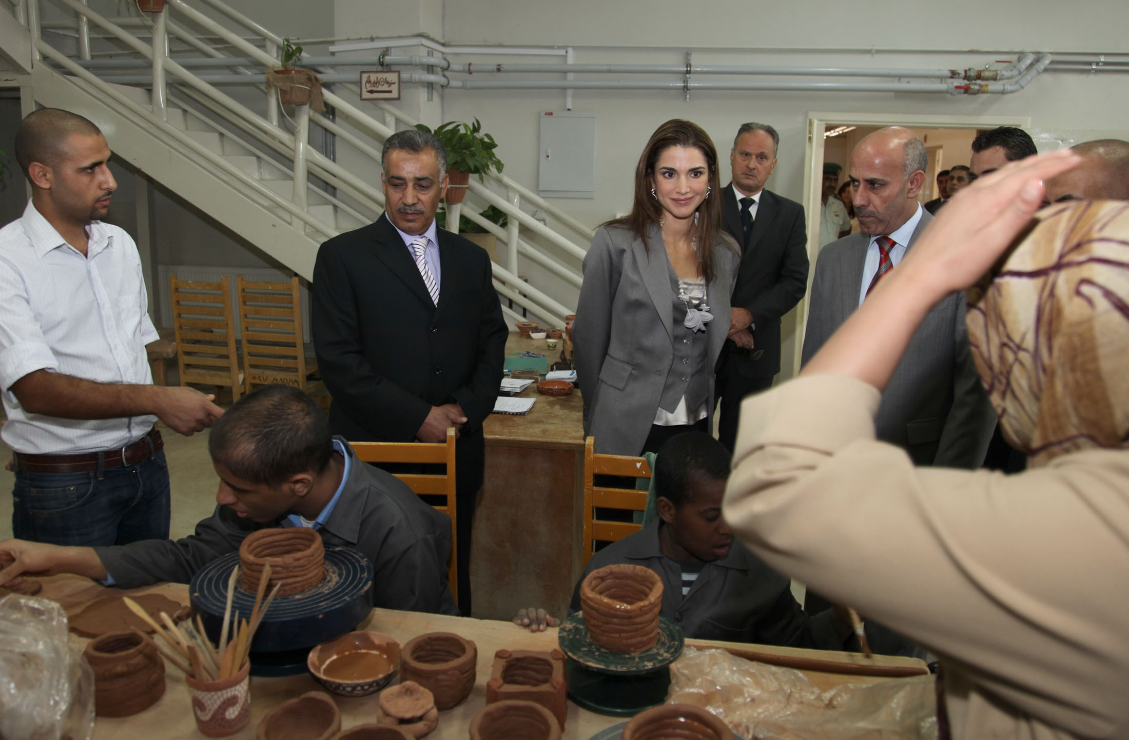 وفي بداية الزيارة تجولت جلالة الملكة رانيا في مشاغل المركز مستمعة الى شرح قدمه مدير المركز المهندس علي شريم حول طبيعة البرامج التدربية التي يوفرها المركز وشاهدت جلالتها جانبا من عمليات التدريب المقدمة لطلاب من دول عربية لديهم احتياجات الخاصة. كما شاهدت نماذج من مشغولات المتدربات في ورش الخزف مستمعة الى شرح عن مدى الاقبال على هذه الورش مستفسرة جلالتها عن تسويق المنتجات ومدى توفر فرص عمل للمتدربات بعد التخريج. يذكر أن مؤسسة التدريب المهني أنشئت بموجب القانون المؤقت رقم (35) لعام 1976. وتهدف لتحقيق الريادة والتميز في تقديم خدمات التدريب المهني، وتصنيف العاملين والمحلات المهنية. ويبلغ عدد معاهد ومراكز التدريب المهني (46) مركزاً ومعهداً منها (10) مراكز اناث، وتنفذ المؤسسة (237) برنامجاً تدريبياً. ومنذ عام 1976 تدرب حوالي 287 ألف شخص، وتقدم الدورات التدريبية بالتعاون مع القطاع الخاص. وقدمت الحكومة الإيطالية ومنظمة العمل الدولية الدعم للمركز بتزويده بمعدات ودعم مادي وفني من خلال منظمة العمل الدولية.