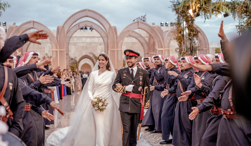 (الديوان الملكي الهاشمي) - أقام جلالة الملك عبدالله الثاني وجلالة الملكة رانيا العبدالله في قصر الحسينية، اليوم الخميس، حفل استقبال بمناسبة زفاف سمو الأمير الحسين بن عبدالله الثاني، ولي العهد، وسمو الأميرة رجوةُ الحسين.