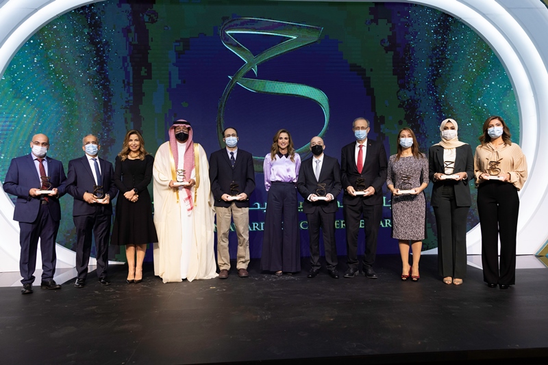 عمّان - تحت رعاية جلالة الملك عبدالله الثاني وجلالة الملكة رانيا العبدالله، وبحضور أصحاب السمو الملكي الأمير طلال بن محمد والأميرة غيداء طلال، سلّمت جلالتها الدروع التكريمية للفائزين بجائزة الحسين لأبحاث السرطان لعام 2021 وذلك خلال حفل أقامته مؤسسة الحسين للسرطان اليوم.