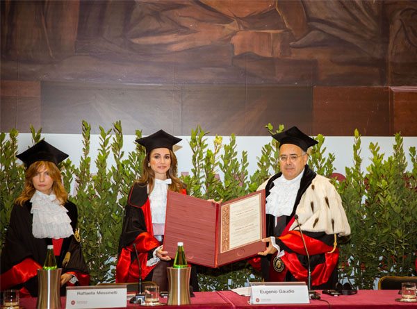 واشتملت مراسم منح الدكتوراه على كلمات لكل من وزيرة التربية والجامعات والابحاث الإيطالية ستيفانيا جيانيني ورئيس الجامعة يوجينيو جوديو اكدا فيها على الدور الهام الذي تلعبه جلالة الملكة رانيا العبدالله في تقريب وجهات النظر وحوار الثقافات واهتمامها بالتعليم على المستوى الاقليمي والعالمي، مشيدين بجهود جلالتها واطلاقها العديد من المبادرات والانشطة التي كان لها بصمات على المستوى الدولي.