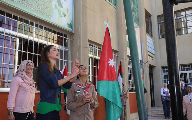 شاركت جلالة الملكة رانيا العبدالله اليوم معلمات وطالبات مدرسة أم السمّاق الشمالي الثانوية للبنات فعاليات طابور مدرستهن الصباحي ورفعت مع الطالبات علم الاردن الذي صاحبه النشيد الوطني. كما زارت مدرسة خلدا الثانوية للبنات، وذلك في اطار حرص جلالتها على متابعة سير العملية التعليمية في المدارس الحكومية مع بداية العام الدراسي.