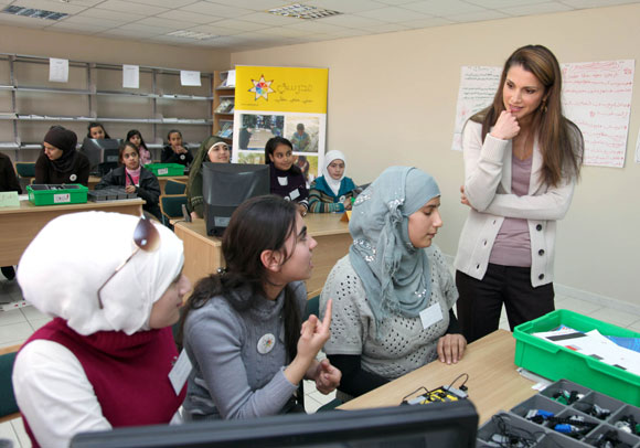 وتفقدت جلالتها ورشة تدريب على العزف قدمتها الفنانة الاردنية زين عوض للطالبات، واطلعت على ورشة عمل حول التفكير النقدي تتدرب فيها طالبات على نشاطات تفاعلية تساعدهن على التفكير النقدي. وتبادلت الحديث مع الطالبات المستفيدات من انشطة ورشة الرسوم المتحركة.