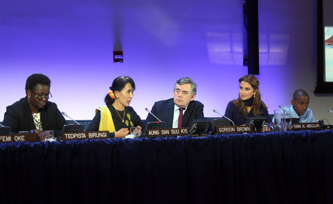 وخلال الجلسة شكر رئيس الوزراء البريطاني السابق غوردون براون جلالة الملكة على عملها الدؤوب في مجال التعليم وقال:"لقد تجولت العالم، وعندما تلتقي بأطفال يتوسلون لارسالهم إلى المدرسة ومتعطشون للتعليم، وترى آباءاً على استعداد للتخلي عن كل شيء من أجل منح أبنائهم هذه الفرصة، حينها ندرك أن واجبنا في غاية الأهمية، ويجب على كل دولة أن تكون جزءاً منه".