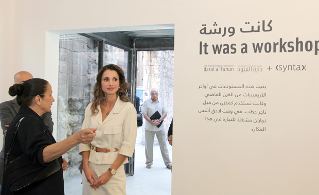 وتجولت جلالتها ترافقها السيدة سهى شومان رئيسة دارة الفنون والسيد عمر شومان رئيس مجلس ادارة مؤسسة خالد شومان في معرض( خارج المكان) الذي تم تنظيمة بالتعاون بين غاليري تيت مودرن في لندن ودارة الفنون بمبادرة من شينا واغستاف (رئيسة المنسقين، تيت مودرن)، وسهى شومان مؤسسة دارة الفنون.