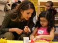 Chats with a child about her artwork, during a visit to the Association to Benefit Children's new Echo Park children and family facility in Harlem. New York, United States / September 20, 2006 تتحدث مع طفلة عن عملها الفني خلال زيارة إلى المركز الجديد الذي …