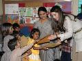 Looks at samples of children's drawings, during a visit to the Ritanjali Learning Center, which was established in 1995 to provide education to out-of-school children. New Delhi, India / March 10, 2006 تطلع على رسومات مجموعة من اطفال مركز /راتنجيلا/ …