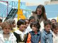 With KG children in the newly renovated playground of the Manshiet Hisban School, during a visit to the community, where she also checked in on needy residents’ homes. Naour, Jordan / May 11, 2005 مع اطفال روضة مدرسة منشية حسبان حيث قامت جلالتها بافتتاح …