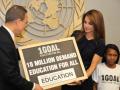 With 12 year old South African schoolgirl Nthabiseng Tshabalala , while handing in an eighteen-million strong 1GOAL petition to the UN Secretary-General, Ban Ki-Moon. NY, USA/ September 22, 2010 الملكة رانيا العبدالله مع سفيرة حملة "هدف 1" من جنوب …