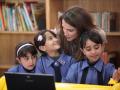 Queen Rania talks to second grade students from Qissaria School in Sweileh, working on the Math Wizz program, which is currently piloted in four public schools, as part of Jordan Education Initiative’s use of technology to promote math skills program. …