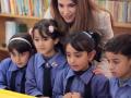 Her Majesty Queen Rania Al Abdullah joins a group of first graders during a visit to Princess Rahma bint Al Hassan Elementary school to inspect Jordan Education Initiative (JEI) programs. Amman, Jordan/ 11 December 2011 جلالة الملكة رانيا العبدالله مع …