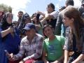In this handout image supplied by the Office of Her Majesty Queen Rania Al Abdullah, Royal Hashemite Court, Queen Rania of Jordan meets Syrian refuges at the Karatepe municipality camp for refugees on the outskirts of Mytilene, on April 25, 2016 in …