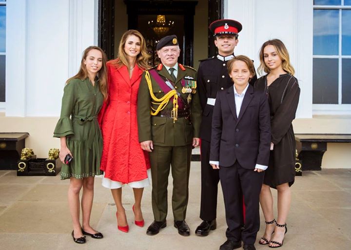 جلالتا الملك عبدالله الثاني والملكة رانيا العبدلله وسمو الأمير هاشم وسمو الأميرة إيمان وسمو الأميرة سلمى خلال حفل تخرج ولي العهد سمو الأمير الحسين من كلية ساندهيرست العسكرية
