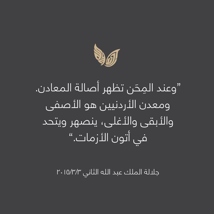 "During difficult times, the true essence of people emerges; and Jordanians have the purest, strongest and most precious essence, that blends to unite us as one in times of crises." His Majesty King Abdullah II, March, 2015.