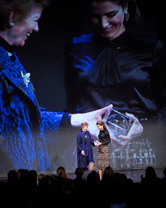 الملكة رانيا خلال حفل تسلم الجائزة العالمية للريادة من منظمة الأصوات الحيوية