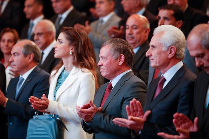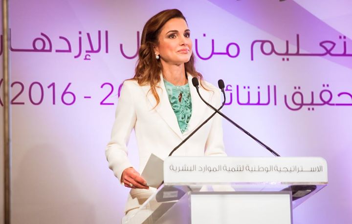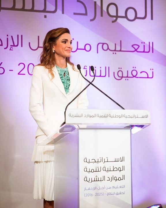 جلالتا الملك عبدالله الثاني والملكة رانيا العبدالله خلال حفل إطلاق الاستراتيجية الوطنية لتنمية الموارد البشرية حيث ألقت جلالتها كلمة حول أهمية إصلاح التعليم في الأردن