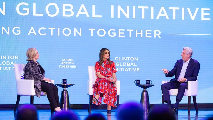 حوار الملكة رانيا مع وزيرة الخارجية الأميركية السابقة هيلاري كلينتون والمفوض السامي للأمم المتحدة لشؤون اللاجئين فيليبو غراندي خلال مبادرة كلينتون العالمية