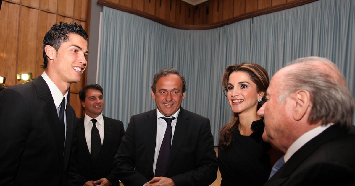 تتحدث مع رئيس الاتحاد الدولي لكرة القدم جوزيف بلاتر وميشيل بلاتيني وكريستيانو رونالدو