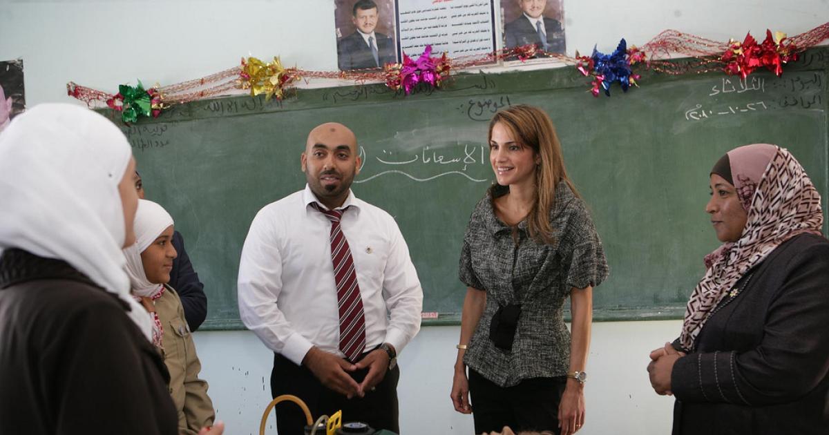 الملكة رانيا خلال إحدى محاضرات التثقيف الصحي في مدرسة أم الهشيم الثانوية للبنات
