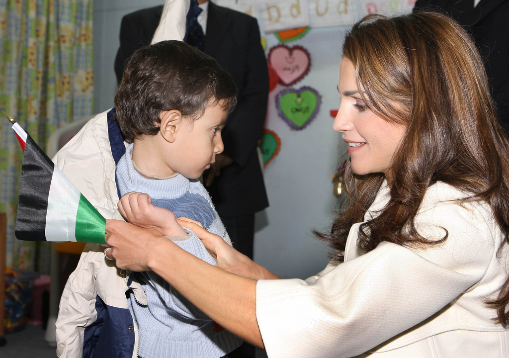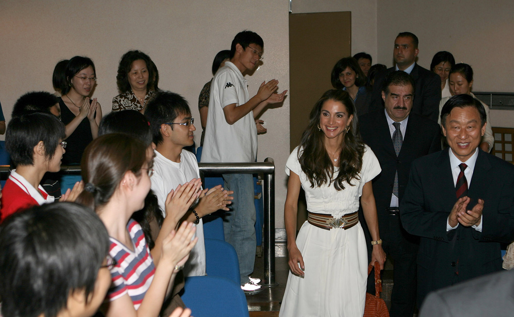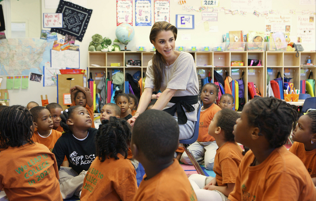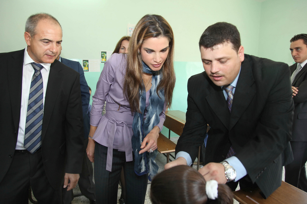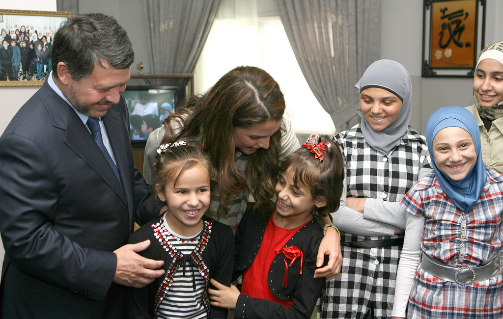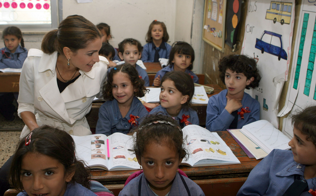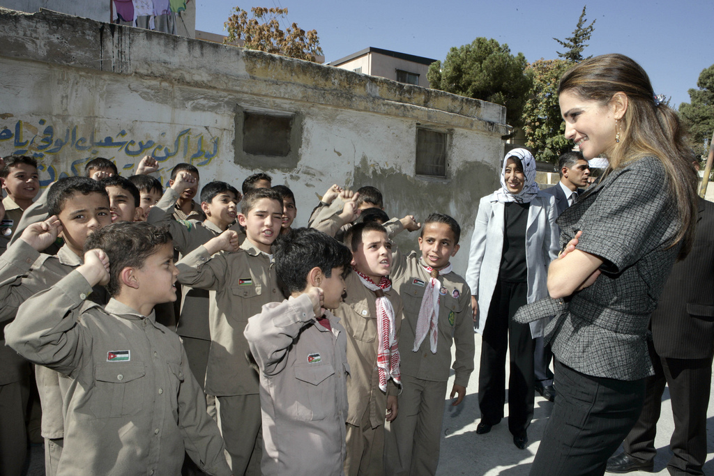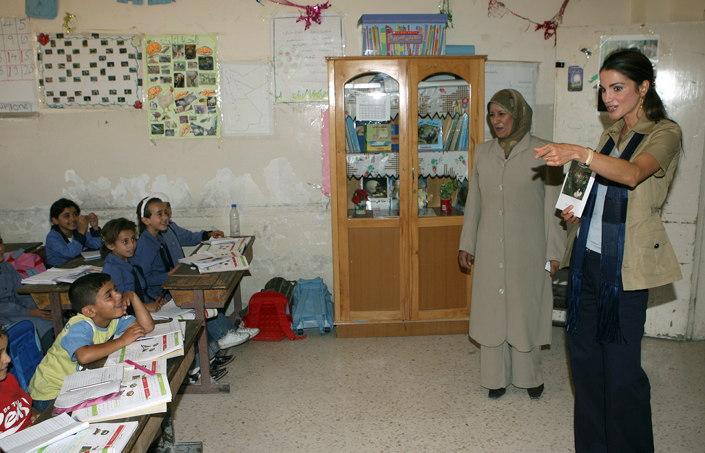 مع الطالبات في مدرسة خوله بنت ثعلبة في صويلح حيث اعلنت جلالتها من تلك المدرسة تبنيها لصيانة المدارس التي زارتها في سلبود والرصيفة وصبحا وصويلح واكدت على أن أطفالنا أمانة وعلينا توفير الفرص المناسبة لهم