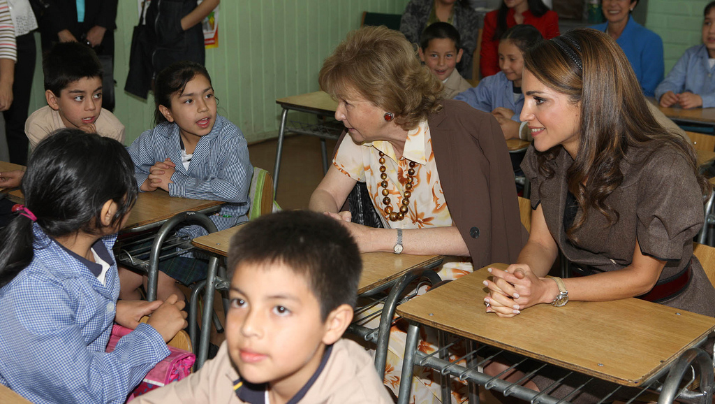 مع وزيرة التعليم التشيلية مع اطفال الصف الثالث في مدرسة ساليتره الاساسية في التشيلي حيث اطلعت جلالتها على أحد البرامج التي تركز على توفير التكنولوجيا في المدارس في التشيلي