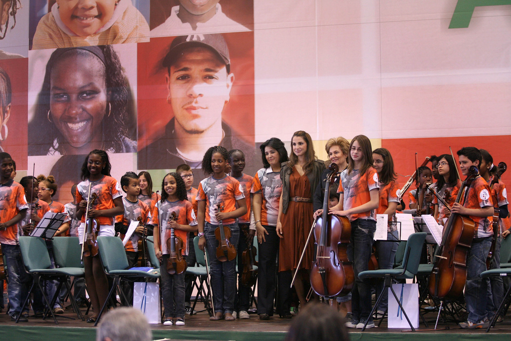 خلال زيارة الى مدرسة ميغيل تورغا في لشبونة حيث استمعت الى معزوفة أداها مجموعة من الطلاب وذلك ضمن برنامج الأوركسترا الذي يهدف الى تشجيع الطلاب من الجنسيات المختلفة على الحوار والتعلم من تجارب زملائهم