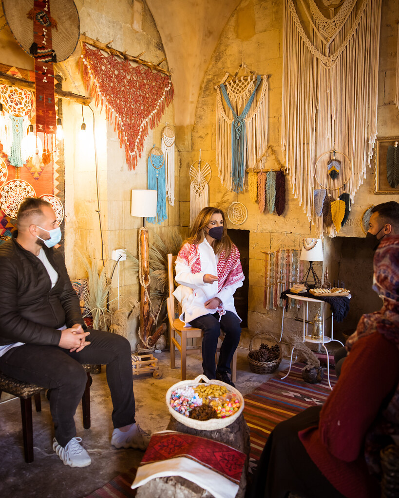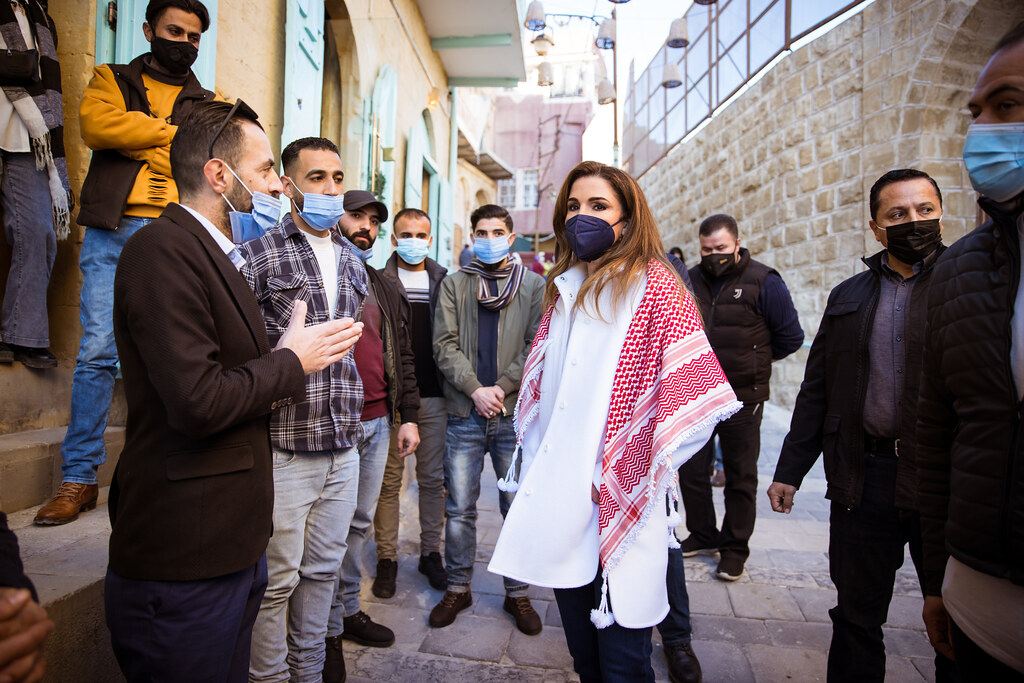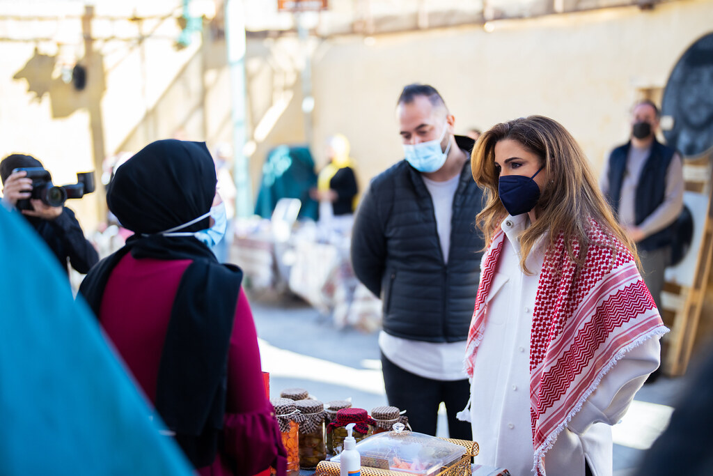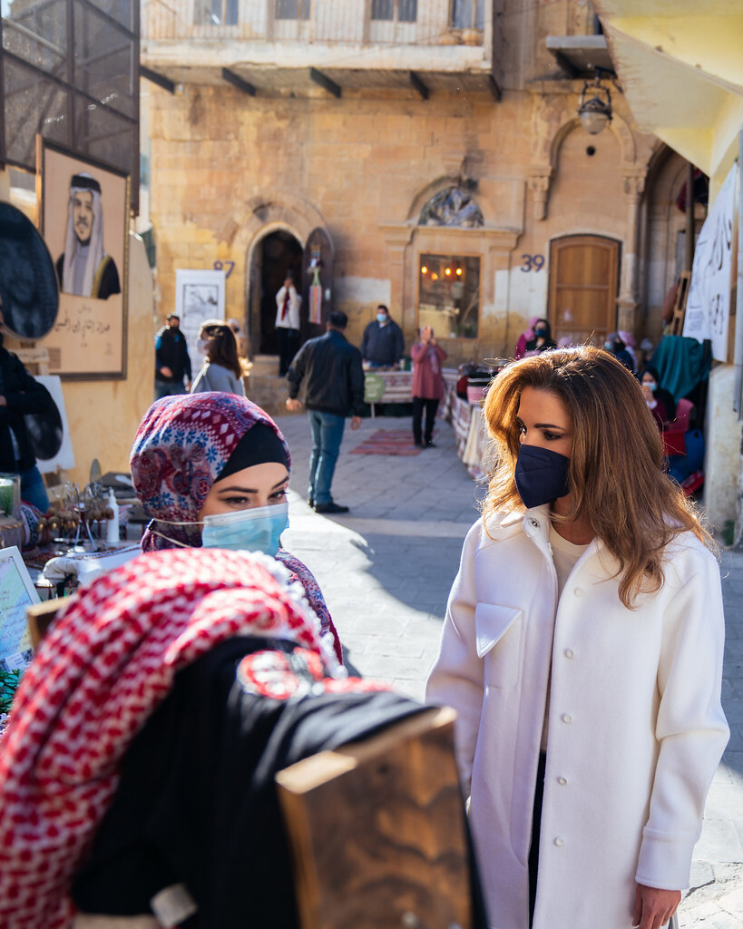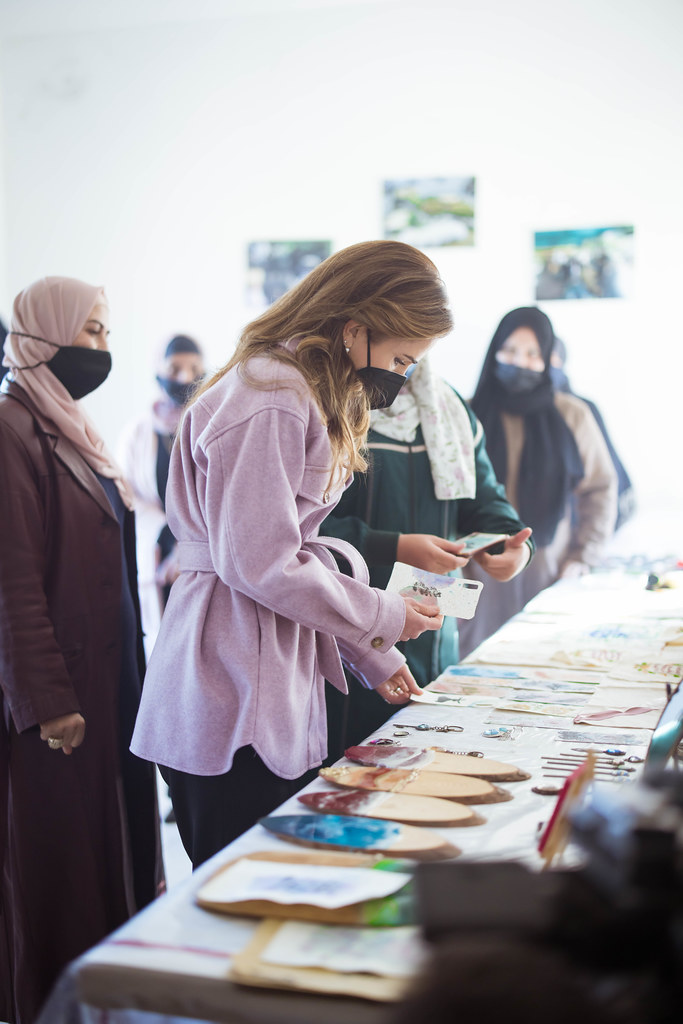 Queen Rania during a visit to Al Salt where she met with the youth members of Al-Khader Center, Handrah Program, Balqawi Wedding Experience, and Darbk Salek
