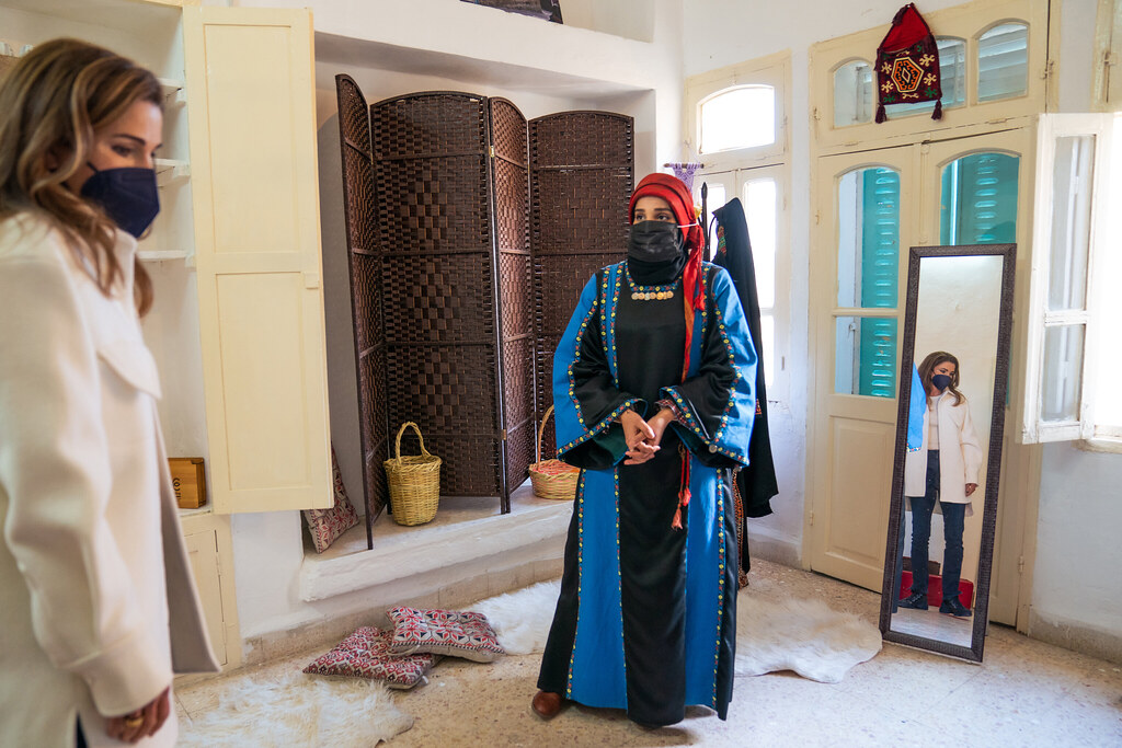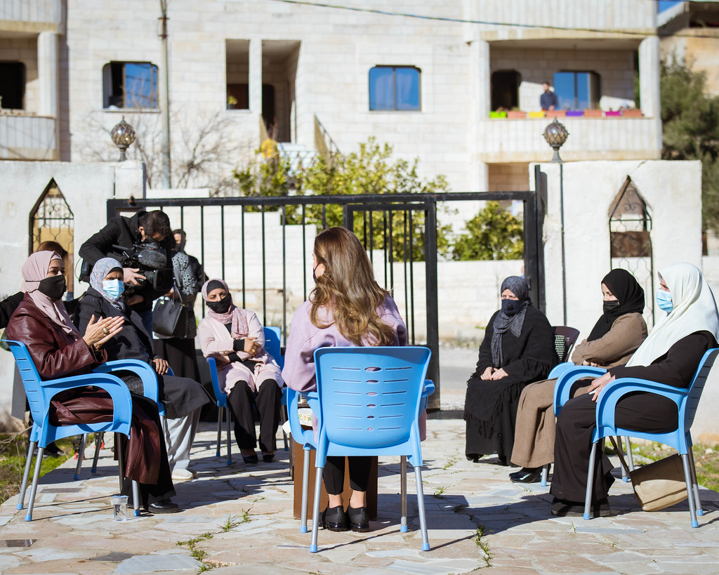 الملكة رانيا خلال زيارة الى السلط حيث التقت بفريق عمل مركز الخضر للتدريب ومبادرة دربك سالك وبرنامج هندرة واطلعت على تجربة العرس البلقاوي