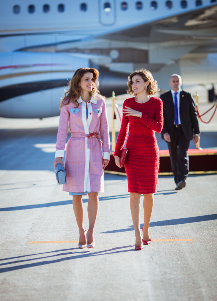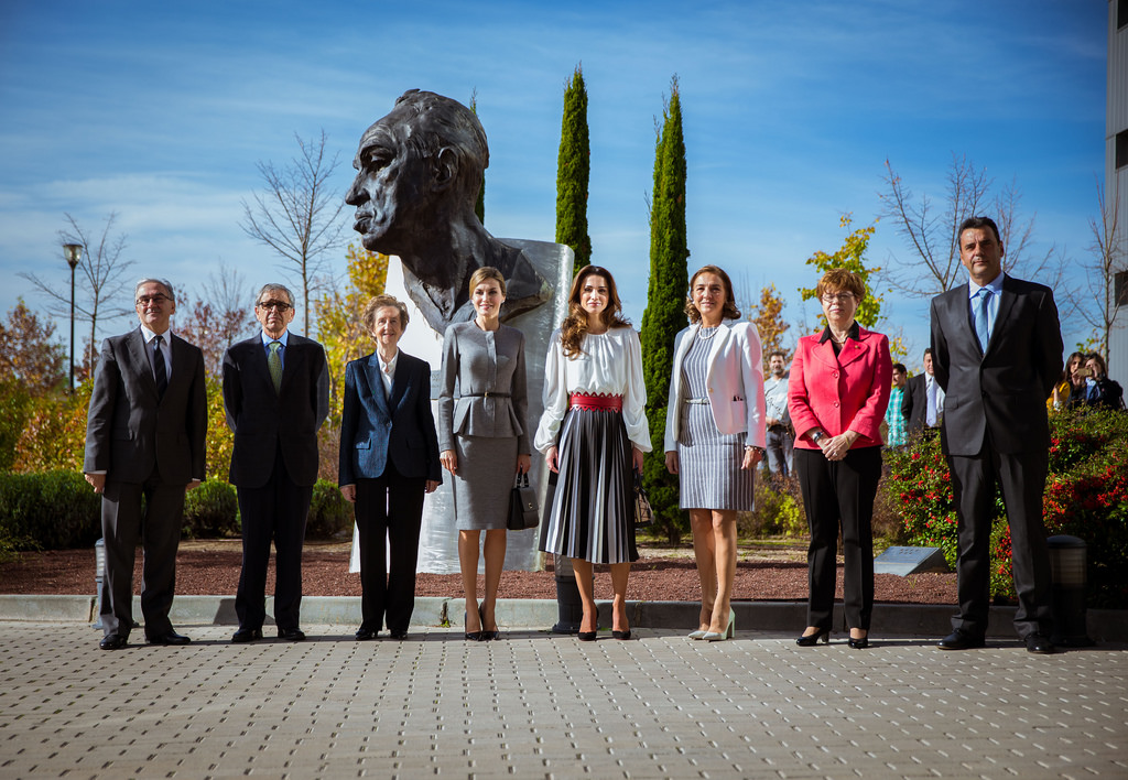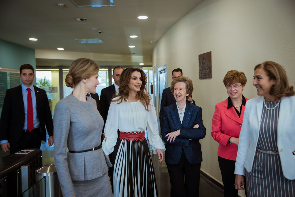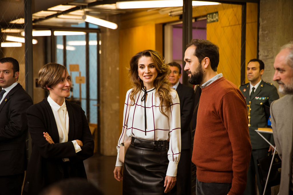 Queen Rania accompanied by Queen Letizia during a visit to Centro de Biología Molecular Severo Ochoa (CBMSO) (Center for Molecular Biology)