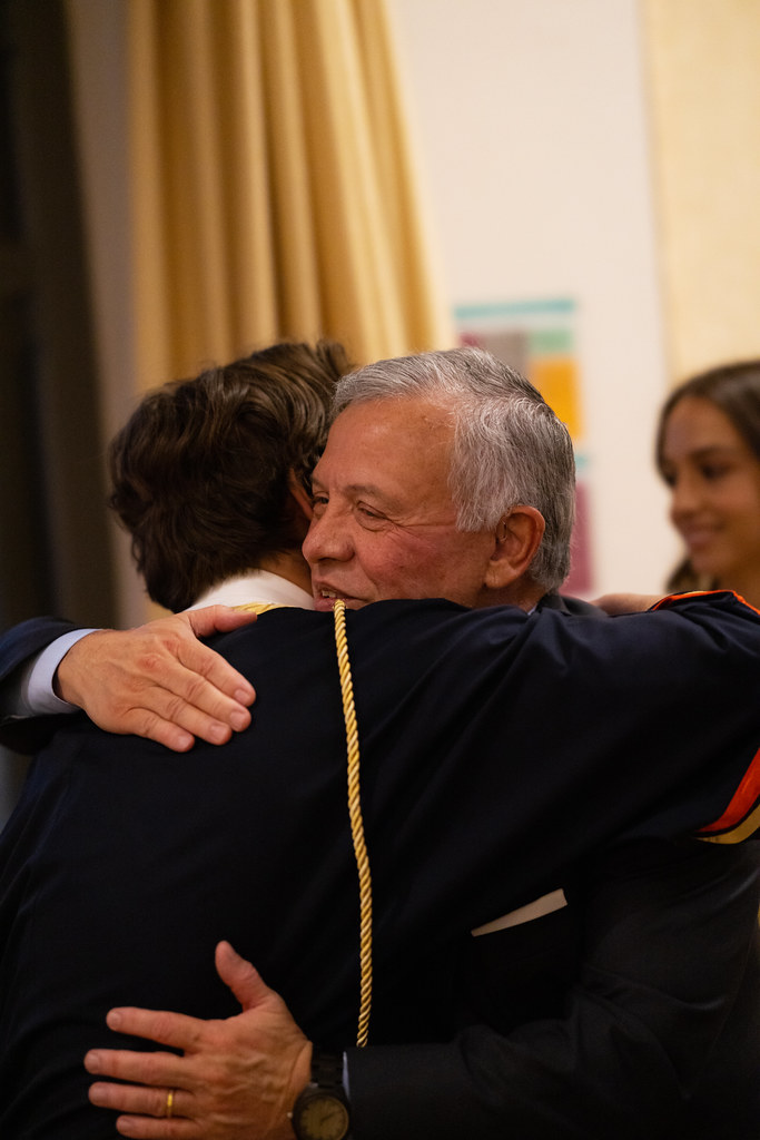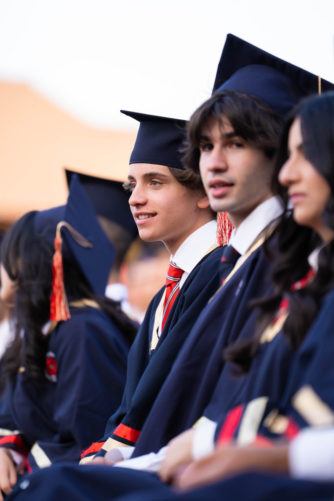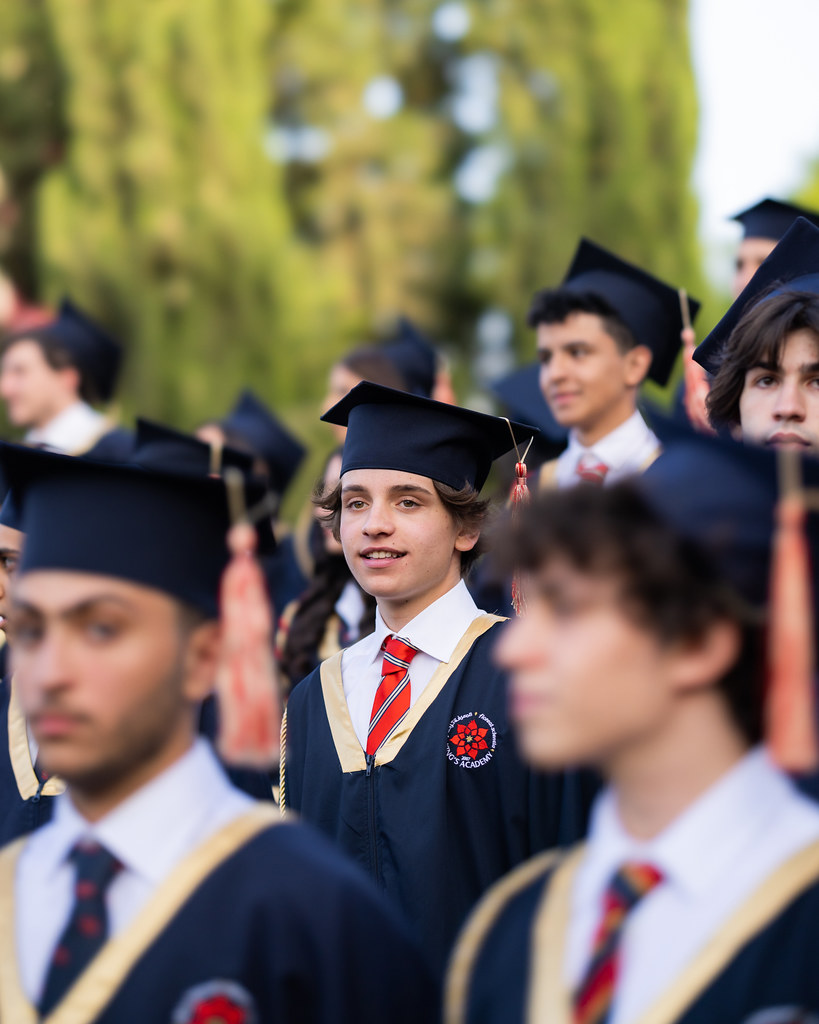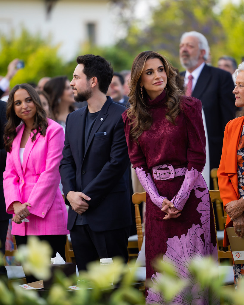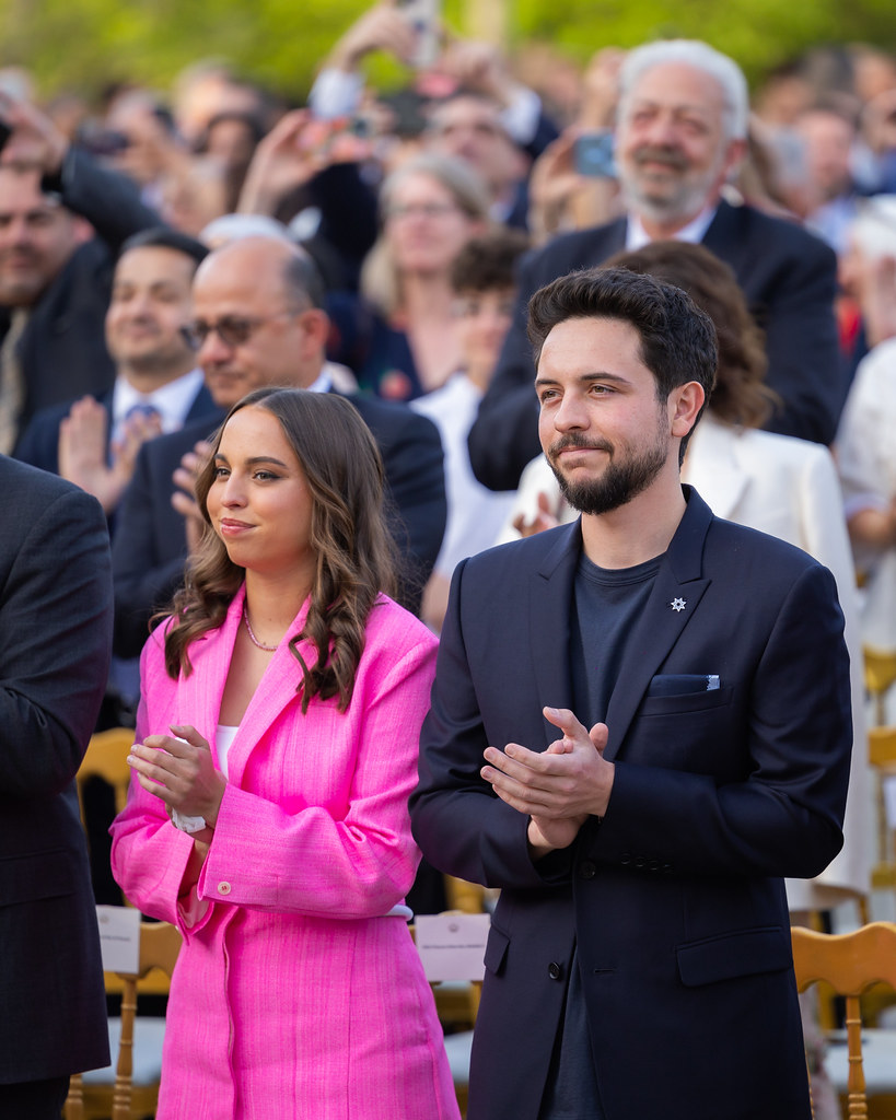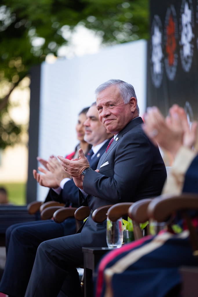 جلالة الملك عبدالله الثاني وجلالة الملكة رانيا العبدالله، وسمو الأمير الحسين بن عبدالله الثاني، ولي العهد، وسمو الأميرة إيمان بنت عبدالله الثاني والسيد جميل ترميوتس والأميرة سلمى بنت عبدالله الثاني خلال حفل تخريج الأمير هاشم بن عبدالله الثاني من مدرسة كينغز أكاديمي