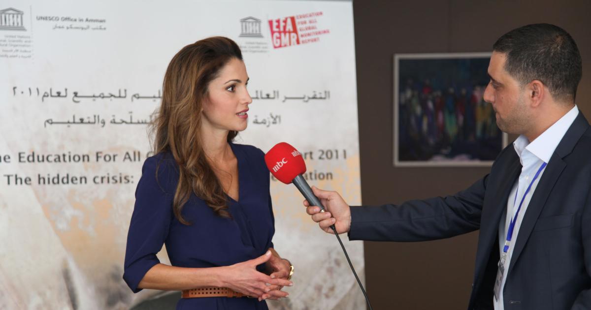 جلالة الملكة رانيا العبدالله في مقابلة مع فضائية الإم بي سي على هامش إطلاق النسخة العربية لتقرير اليونسكو لرصد التعليم للجميع الذي صدر هذا العام تحت عنوان "الأزمة الخفية: النزاعات المسلحة والتعليم".