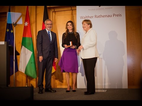 الملكة رانيا تلقي كلمة بعد تسلمها جائزة والتر راثيناو من المستشارة أنجيلا ميركل في برلين