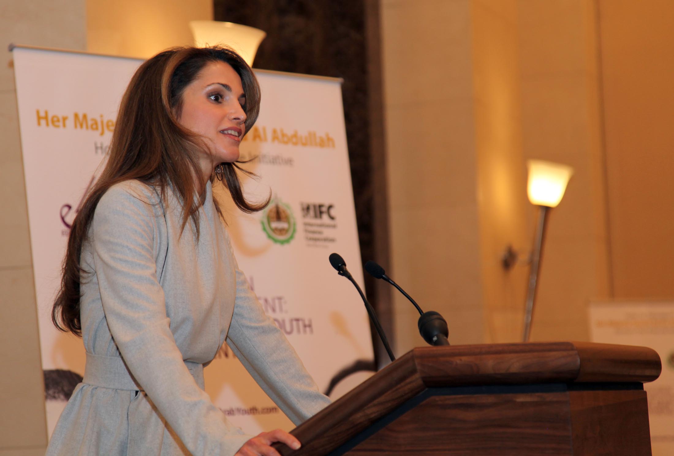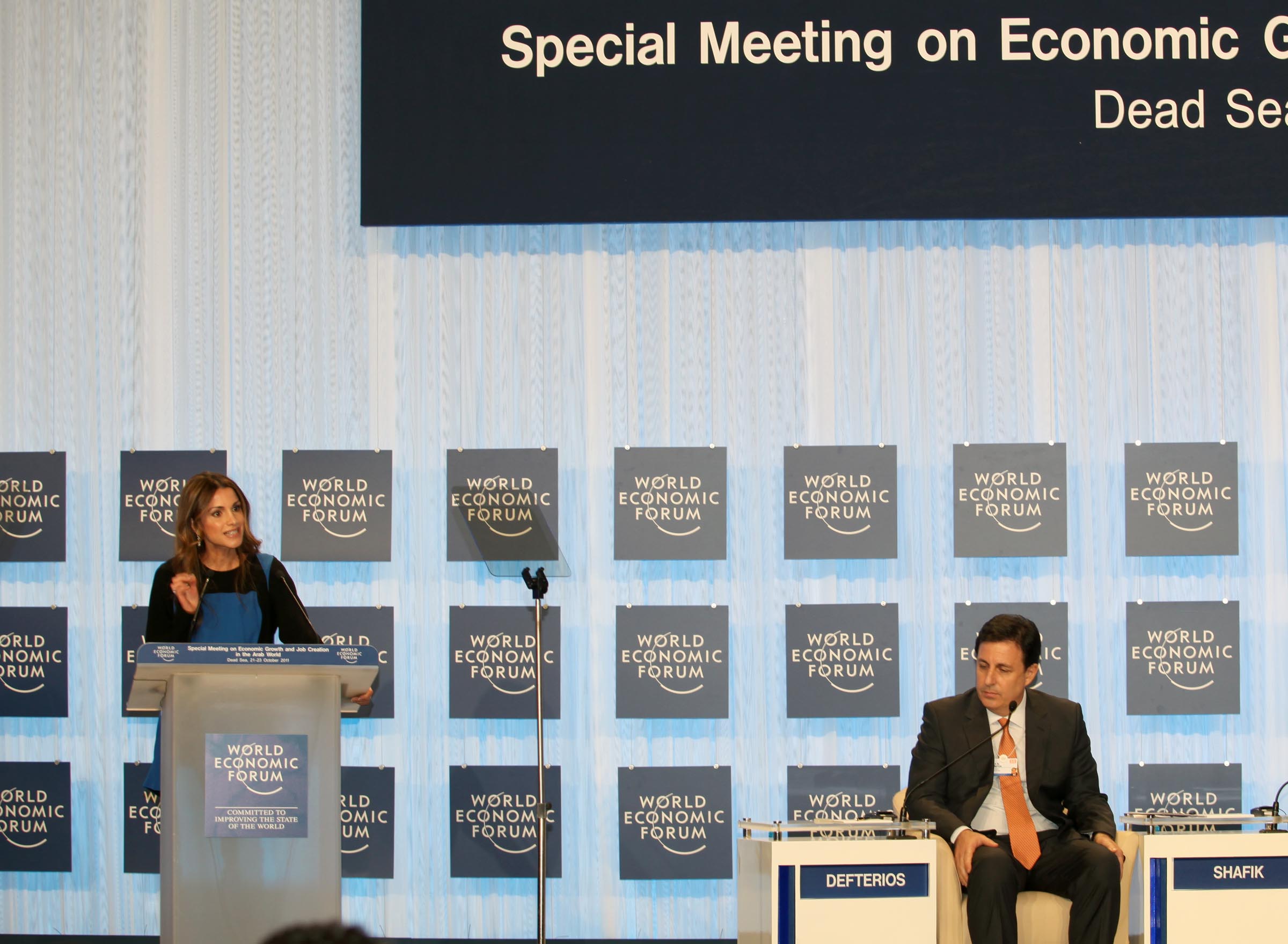 Her Majesty delivers opening remarks during the plenary session: Addressing The Employment Challenge at the World Economic Forum, held at the Dead Sea, Jordan in October, 2011.