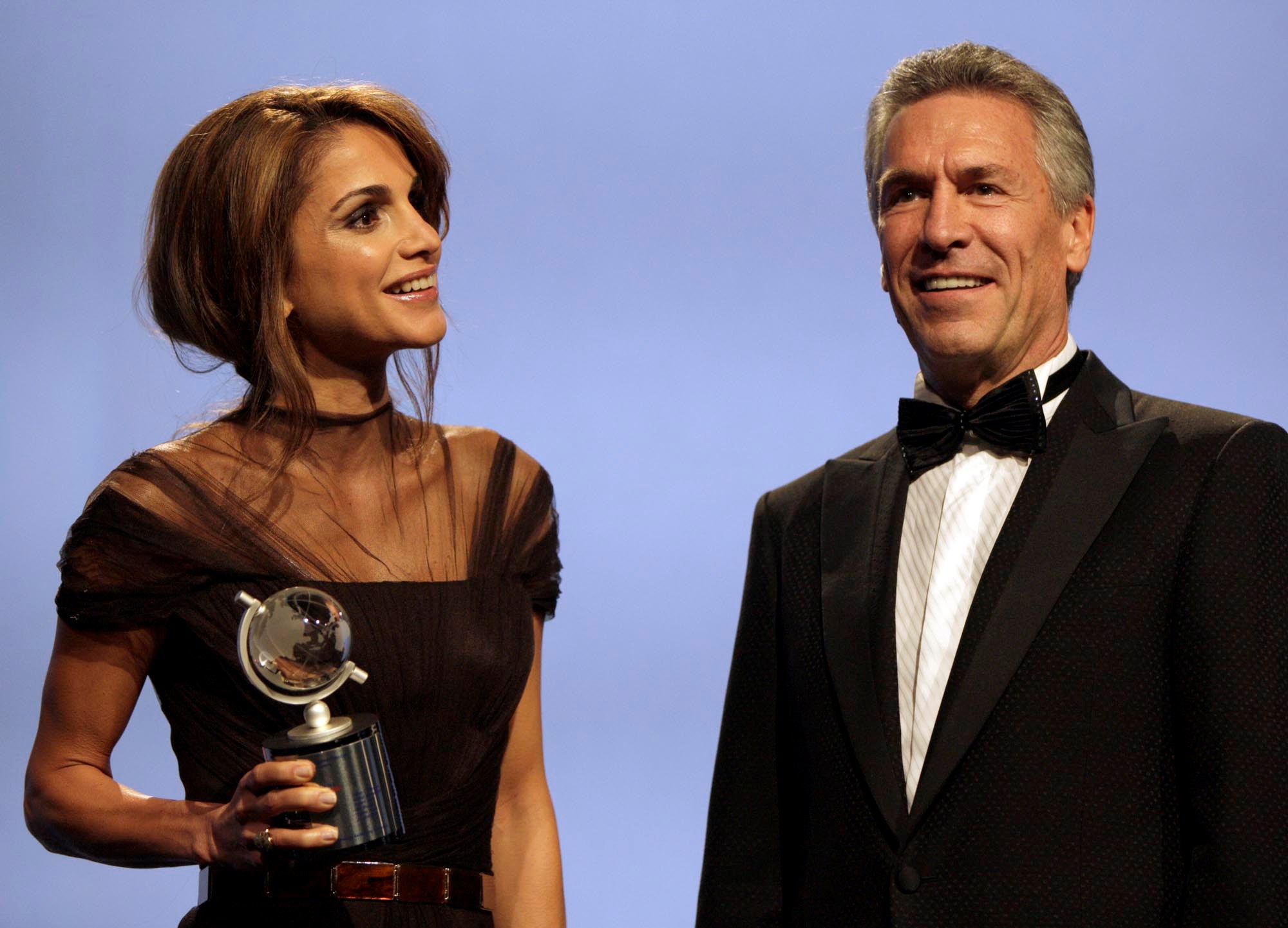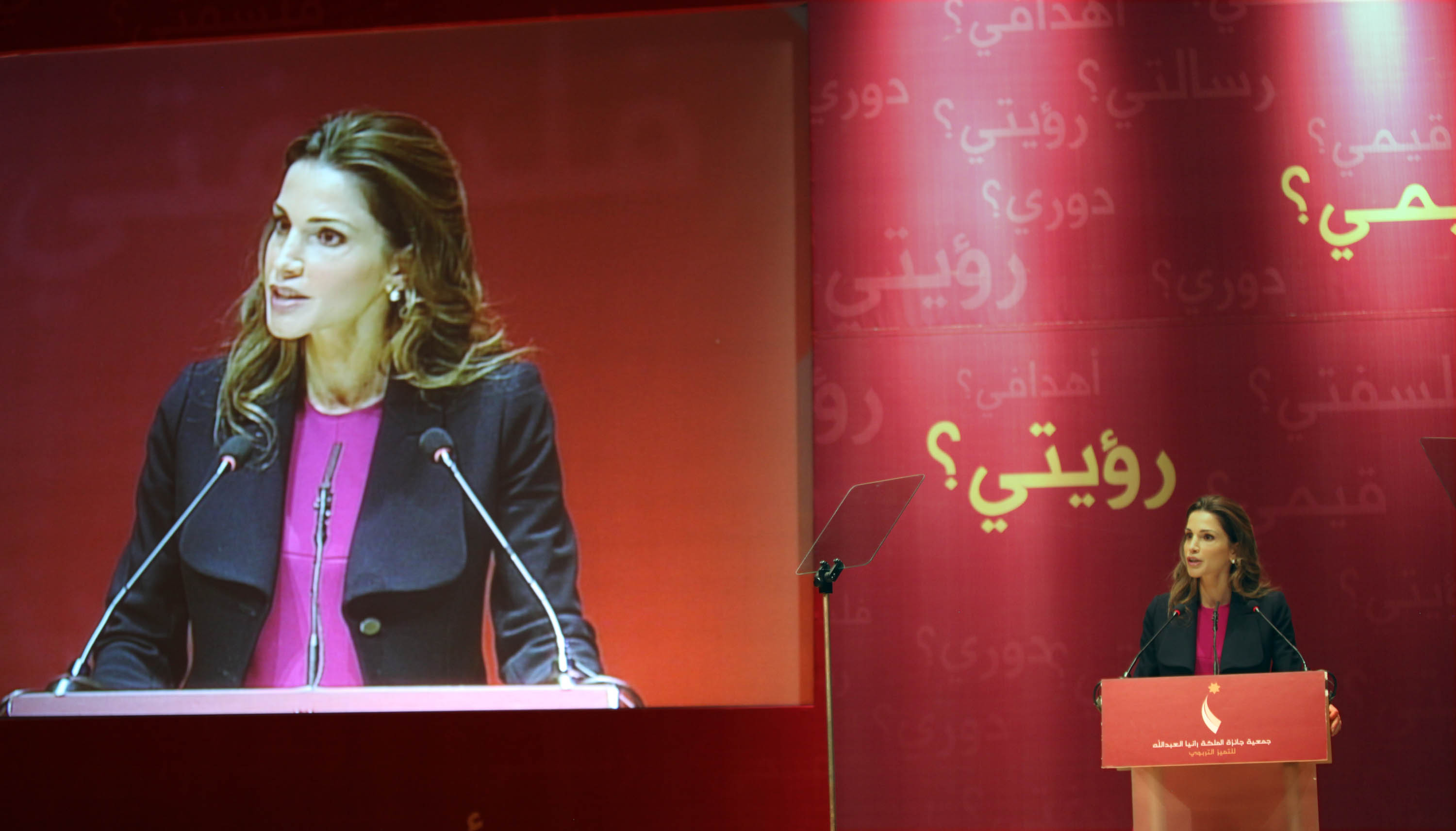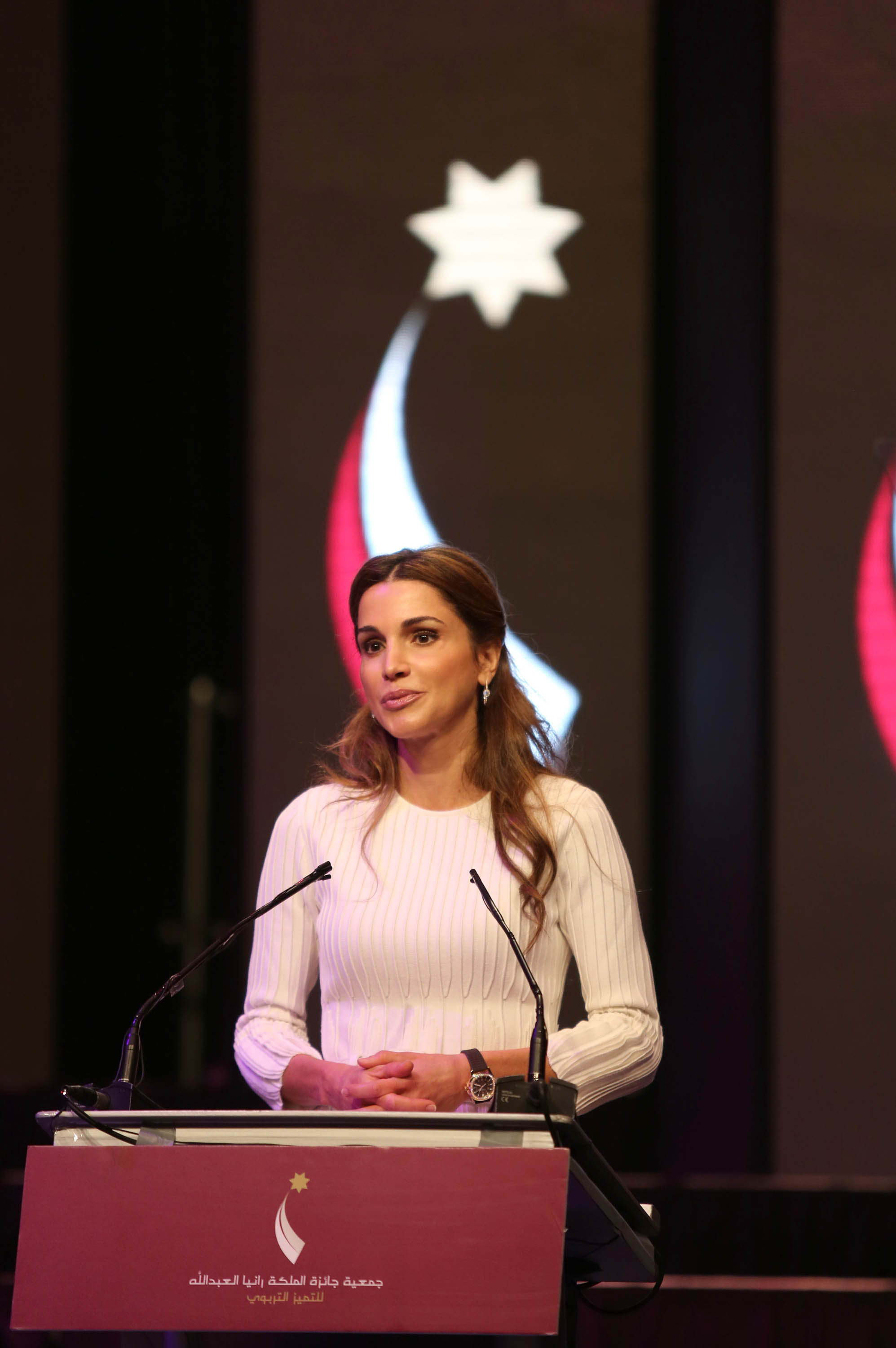 Queen Rania at an award ceremony honoring winners of the Queen Rania Al Abdullah Award for Distinguished Principals and the award for Distinguished Teachers.