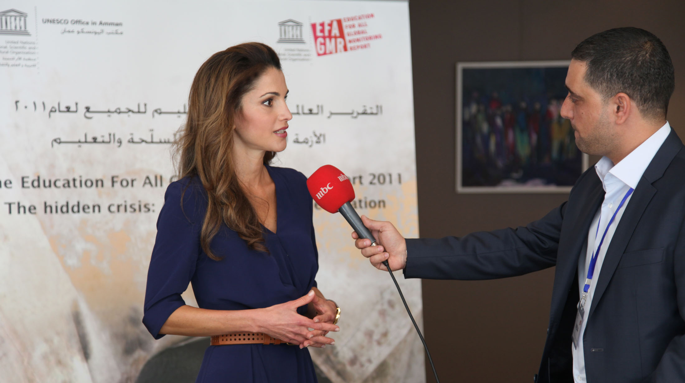 جلالة الملكة رانيا العبدالله في مقابلة مع فضائية الإم بي سي على هامش إطلاق النسخة العربية لتقرير اليونسكو لرصد التعليم للجميع الذي صدر هذا العام تحت عنوان "الأزمة الخفية: النزاعات المسلحة والتعليم".