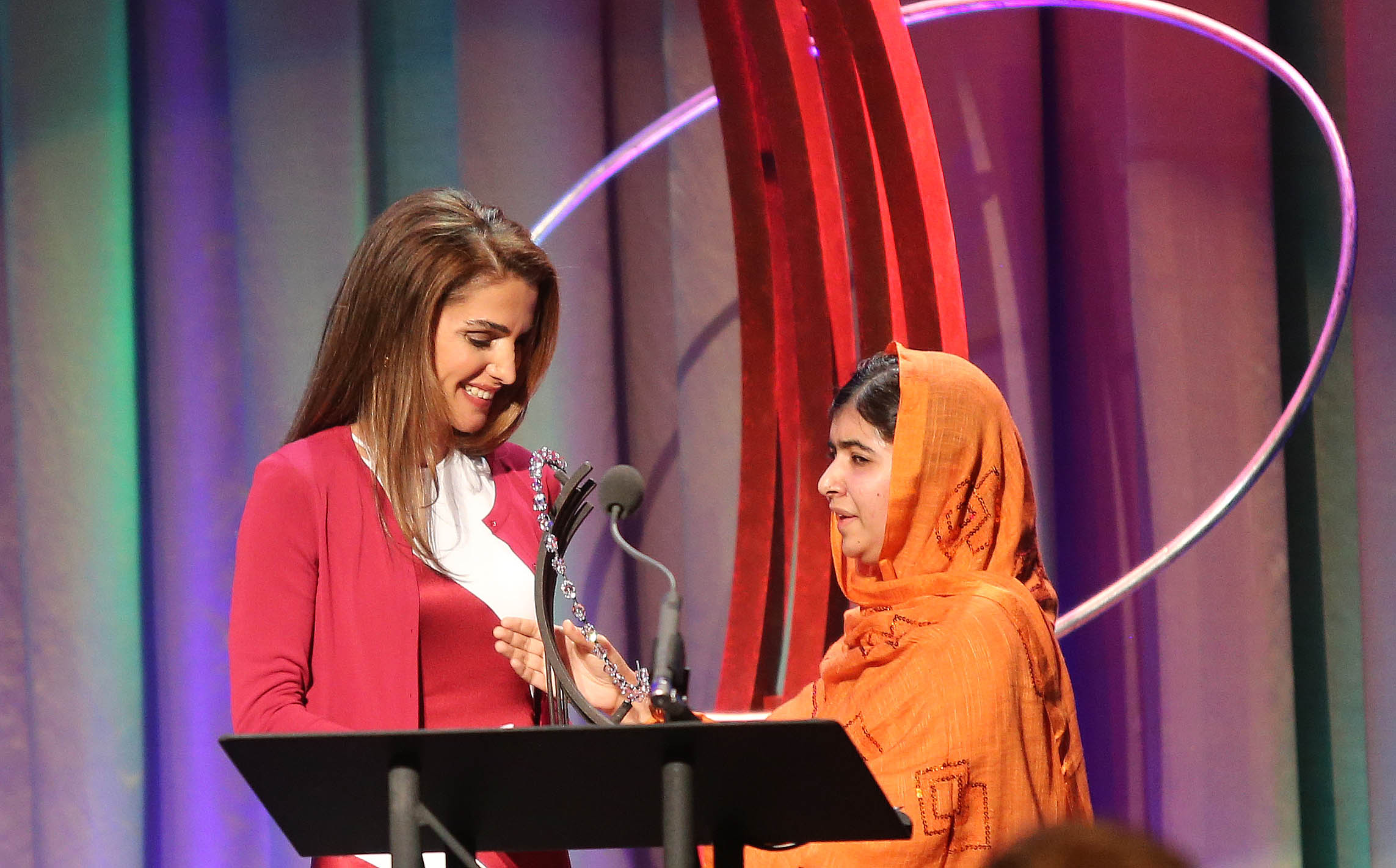 جلالة الملكة رانيا العبدالله تلقي كلمة خلال حفل جوائز مبادرة كلنتون العالمية حيث سلمت جائزة المواطنة العالمية للناشطة الباكستانية الملالا يوسفزاي المدافعة عن حق الفتيات في التعليم.