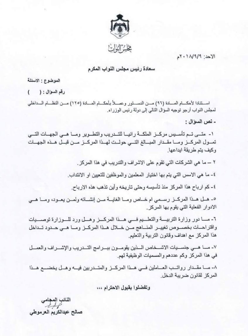 مع كل التقدير لسعادة النائب صالح العرموطي، لدي استفسار بسيط: ما هو "مركز الملكة رانيا للتدريب والتطوير" الذي تشير إليه في سؤالك؟ فأنا لست على علم بأي مؤسسة تحمل هذا الإسم. https://t.co/qjnKl4LBlR