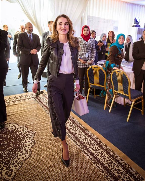 الملكة رانيا خلال زيارة إلى مدرسة البيادر المهنية الثانوية للبنات لتكريم المدارس التي تم اعتمادها ضمن برنامج الاعتماد الوطني للمدارس الصحية الذي تنفذه الجمعية الملكية للتوعية الصحية