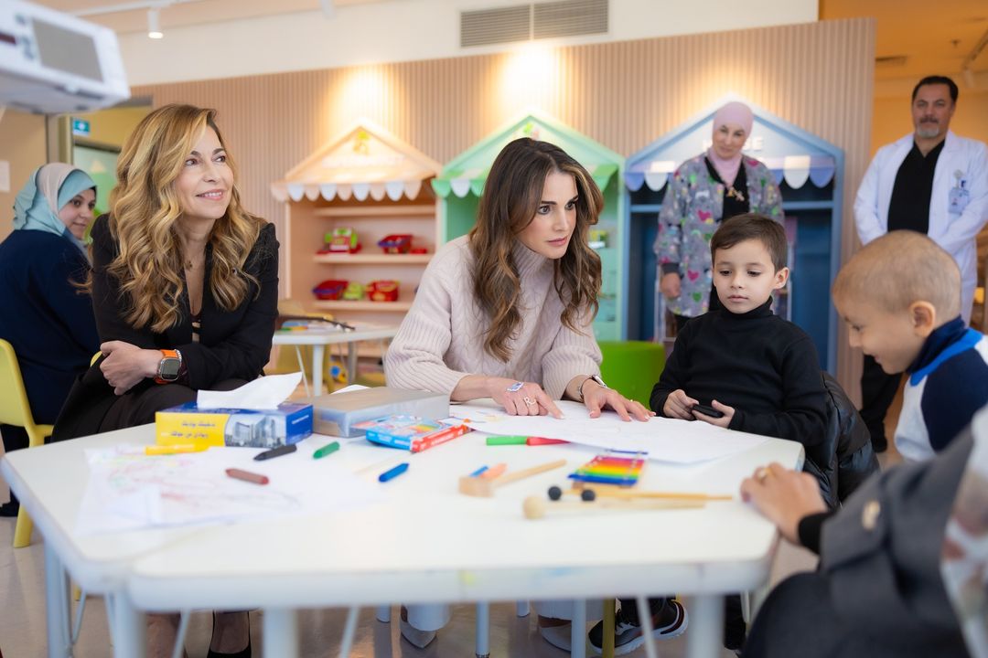 الملكة رانيا والأميرة غيداء طلال خلال زيارة إلى مركز الحسين للسرطان لزيارة أطفال مصابين بالسرطان من غزة
