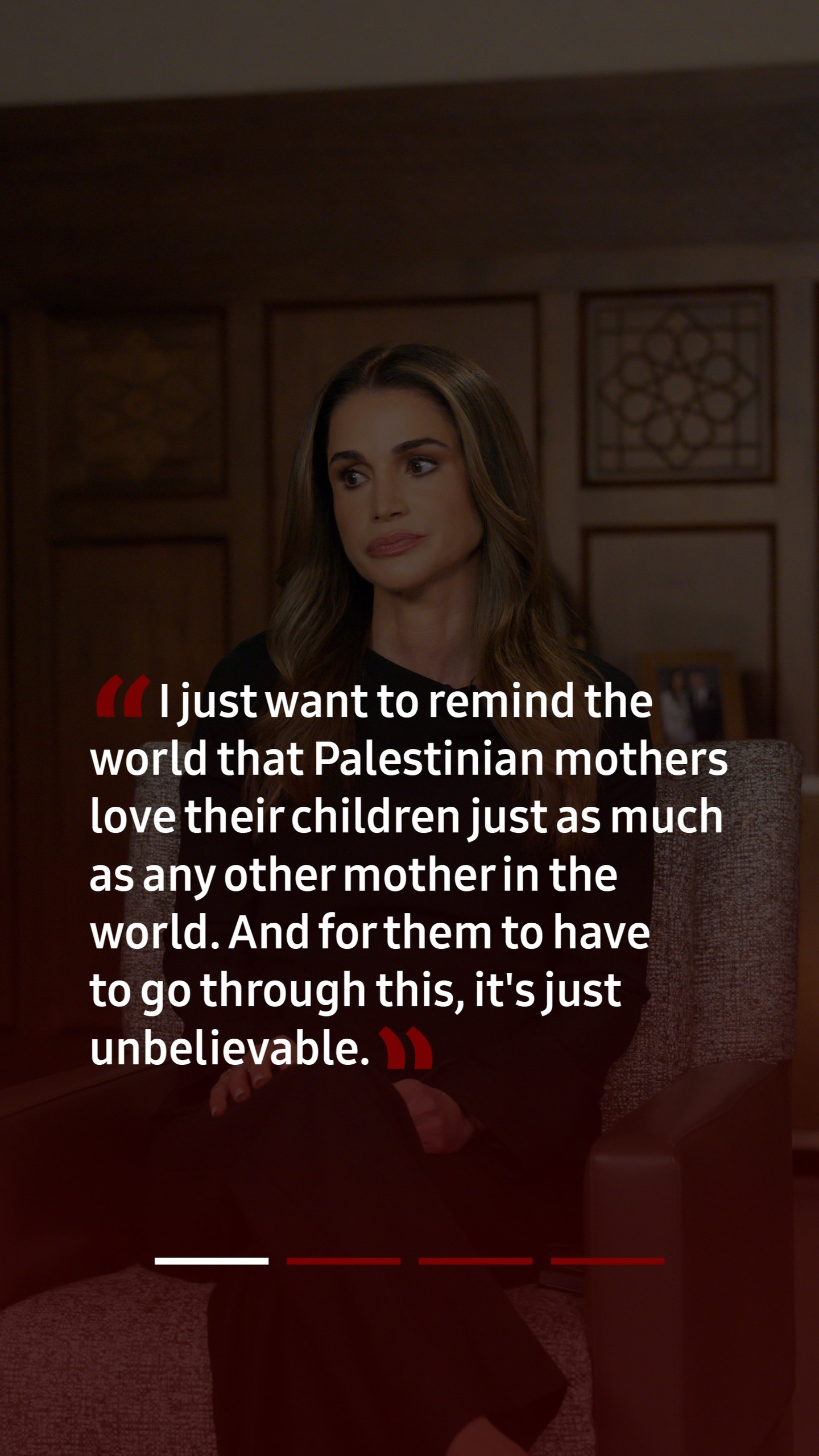 أريد فقط أن أذكّر العالم بأن الأمهات الفلسطينيات يحبون أطفالهن تماما كما تحب أي أم أخرى أطفالها في العالم. وبالنسبة لهم أن يمروا بهذا، فهو أمر لا يصدق
