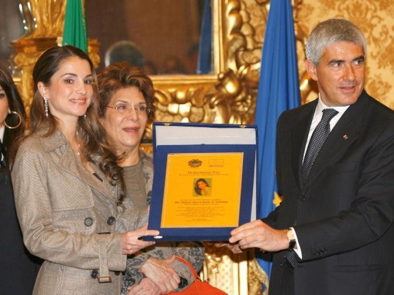 Her Majesty Queen Rania Al Abdullah of Jordan received an award from the Fondazione Mediterraneo in...