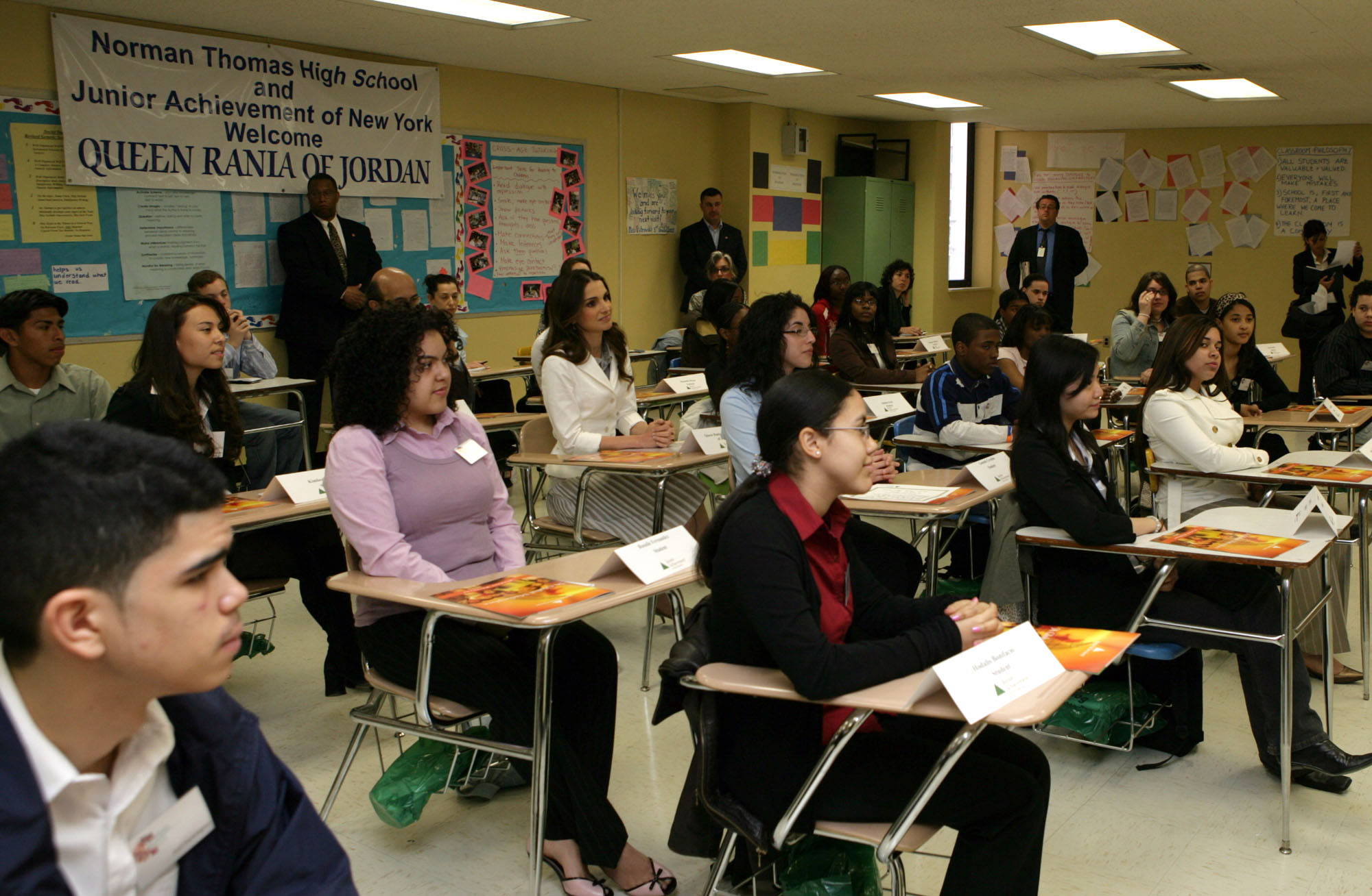 Queen Rania is the regional ambassador of INJAZ. During her visit to Norman Thomas High School, Her Majesty noted how both JA and INJAZ bring something more practical to education and nurture skills and values such as self confidence, leadership, and creativity and bring a spirit of entrepreneurship into the classroom.