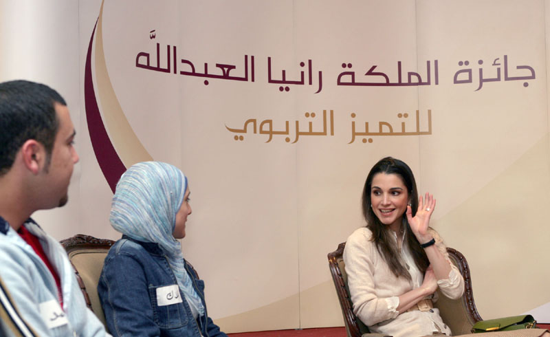 (Jordan Times, Mohammad Ghazal - Amman) Her Majesty Queen Rania joined public high school students from around the Kingdom in Amman on Sunday in a discussion during which they briefed her on their criteria for a distinguished teacher. The meeting took place during the launch of the logo for the Queen Rania Excellence Award for Teaching, which is dedicated to distinguished teachers this year. During the discussion with the students, who took part in workshops to determine the characteristics of a distinguished teacher, the Queen underlined the importance of a teacher's role in developing students' methods of thinking. “The teacher is the one who is capable of making available a suitable atmosphere for the students to learn regardless of the availability of educational tools,” she told the students, adding that the award is meant to encourage teachers to enhance their capabilities and skills. Students shared with the Queen the qualities they felt define a distinguished teacher, including honesty in conveying information, acceptance of criticism and capability of dialogue. The students also said that distinguished teachers should keep up to date with the latest technologies, be facilitators in the educational process rather than spoon-feeding information, and must be in tune with students' needs. Minister of Education and Minister of Higher Education and Scientific Research Khalid Touqan explained that, while this year the award will highlight distinguished teachers, in the future the scope would be expanded. “The theme of this year's award will be for distinguished teacher and each year there will be a new, different theme under the award such as the distinguished student, principal or educational supervisor,” Touqan told reporters yesterday. Earlier in the day, the Queen met with the award's steering committee, which includes members from the Ministry of Education, the private sector, nonprofit companies and representatives from the Queen's office. The committee briefed Her Majesty on the standards of the award and its goals. The minister said that the award seeks to develop teaching, encourage society's appreciation of educators, lift the morale of the instructors and motivate them to excel. According to Touqan, the award will be granted to a winner in each of the five following categories: Kindergarten through 3rd grade, 4th through 8th grades, 9th through 10th grades, secondary school teachers in the academic stream, and secondary school instructors in the vocational stream. Award recipients will receive a certificate and a cash prize, and the winner will likely be promoted on the civil service scale, according to the minister. Applications will be accepted as of April 1, 2006, while the award winners will be announced on Oct. 5, 2006, in conjunction with Teacher's Day in the Kingdom. Eligible educators must teach in the country's public schools and have at least three years of experience. They must also be full time instructors. According to official figures, there are more than 50,000 teachers in the Kingdom's public schools. Touqan explained that after teachers apply, the award's evaluation committee — to be formed soon — would assess the applications, which should include the teachers' achievements and success stories. The committee will then carry out field visits to review these achievements on the ground. The minister pointed out that an independent committee is supervising the award. Excellence Award for Teaching Evaluation criteria 1. Personal philosophy and crucial values of the teacher. 2. Efficiency and independence of education. 3. Resource management. 4. Professional development. 5. Parents and local society participation. 6. Work relationships and interacting with others. 7. Creativity and innovation. 8. Evaluation and assessment. 9. Outcomes and achievements. Objectives 1. Contributing to the development of education to graduate intellectual and students devoted to their community. 2. Increasing society's appreciation for the role of teachers and lifting the spirit of teachers. In addition, encouraging more enthusiasm for the profession. 3. Facilitating the exchange of creative ideas and encouraging interaction between parties carrying out an essential role in education. 4. Enhancing the benefits of education after the educational stage by relating what students learn in school with their practical lives. 5. Providing a model for teachers and schools to help them achieve excellence and improvement. 6. Honouring distinguished teachers and evaluating them according to subjective and scientific standards and transparency. 7. Highlighting the importance of interaction between schools and their local environment.