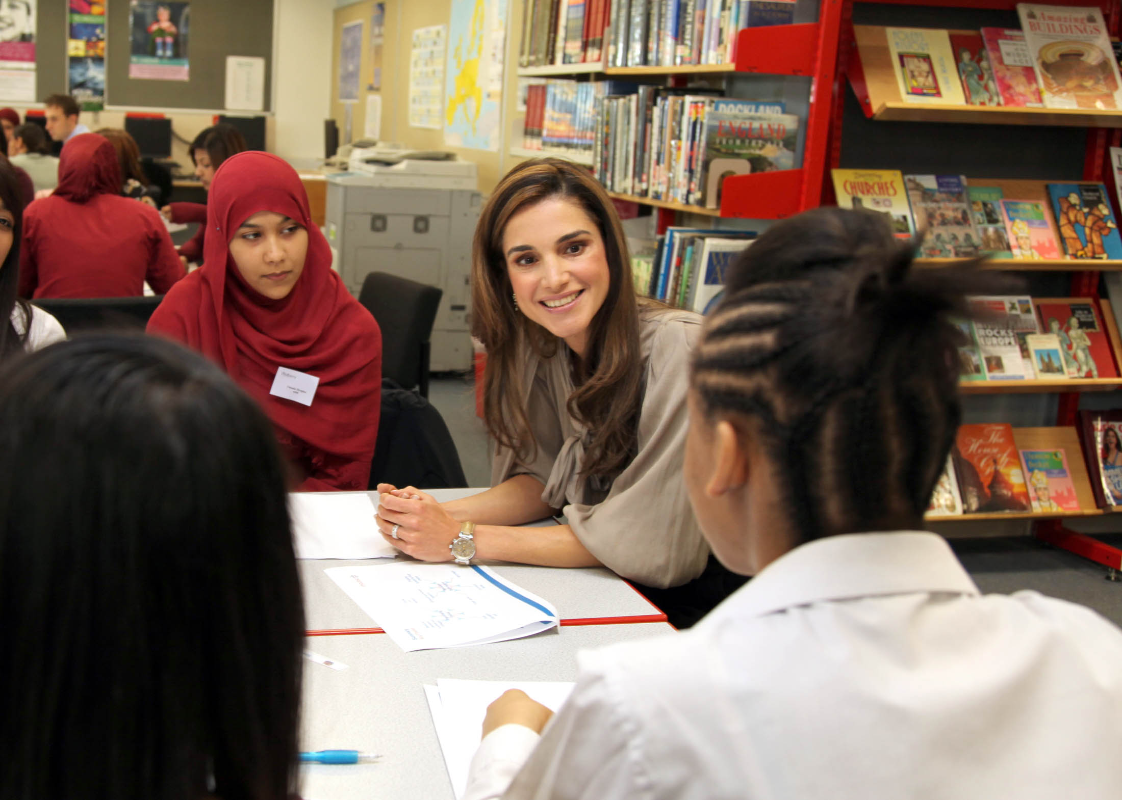 Accompanying His Majesty King Abdullah II on a working visit to the UK, Queen Rania arrived at the school to meet with HRH Princess Badiya bint El Hassan, Chairman of Mosaic, Vanessa Ogden, Head teacher at the Mulberry School, John O’Brien, Managing Director of Mosaic and Khawar Mann, Mosaic Board Member. In a brief overview of the programme, Princess Badiya explained that the Mosaic program, which was launched in November 2007, was designed to support young Muslims and their peers growing up in disadvantaged areas in the UK. In particular, the Mosaic Mentoring Program matches volunteer mentors with young Muslims and others at schools and via community groups based areas. While most mentors are Muslim and operate in areas of high Muslim population, all young people can participate in benefiting from the programme. The programme aims to raise the aspirations of all young people who are growing up in deprived areas through mentoring and enterprise and leadership development, and provide access to opportunities otherwise not available to them. During the visit to the school, Her Majesty also attended a formal mentoring session with a group of tenth grade students and was briefed by Lipena Begum, Mosaic London Regional Manager, on the main aspects and functions of the mentoring scheme. Students also shared with Her Majesty how the mentoring program has positively impacted their life and their outlook on the future. In addition, Queen Rania witnessed a demonstration of the Mosaic Enterprise Challenge in which teams of students are challenged to develop and market new products. The game is an engaging way of introducing enterprise to teens and creates a realistic business scenario through a unique computer software interface which the children can easily interact with. Other initiatives launched by Mosaic, which targets both primary and secondary school Muslim and non-Muslim children, include employability support schemes for young offenders, “World of Work” visits to major private sector companies and community media workshops. The Mulberry School, located in the heart of Tower Hamlet’s multicultural community, enrolls approximately 1400 students between the ages of 11 and 19 out of 98% are Muslim. Since 2008, Mosaic provided a total of 5,376 mentoring experiences in local communities through the work of 500 active volunteers engaged throughout the UK. In addition, the Mosaic International Summer School brings together 90 young Muslim leaders hailing from 14 different countries.