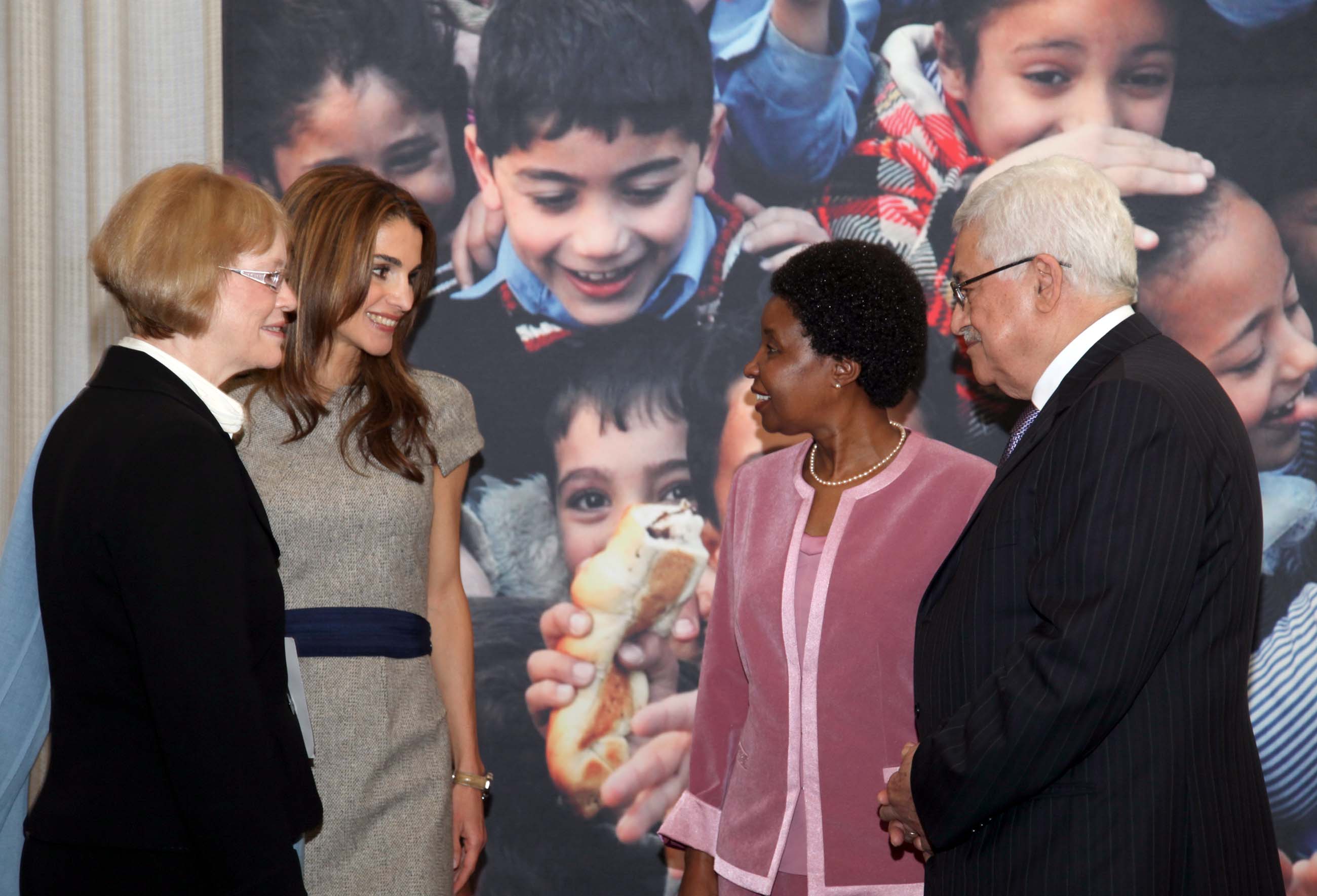 During the event, held in the United Nations Building in New York, Queen Rania joined UN Deputy Secretary-General Asha-Rose Migiro and President Abbas of Palestine in the unveiling of the UNRWA@60 banner.