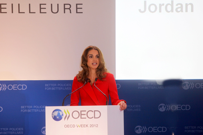 (Office of Her Majesty, Press Department- Paris) Her Majesty Queen Rania Al Abdullah opened the OECD Forum 2012 in Paris today with a keynote address that highlighted the pivotal role that education plays in narrowing the inequality gap across the world and “creating equitable opportunities for all.”