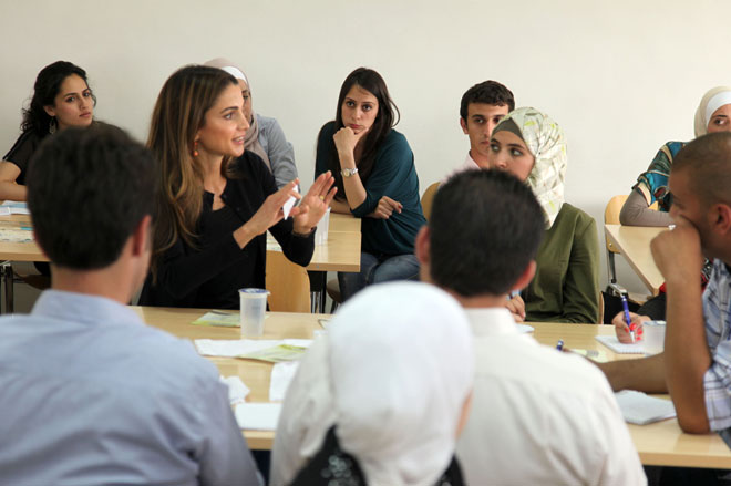 (Office of Her Majesty, Press Department- Amman) Her Majesty Queen Rania Al Abdullah dropped in on a course conducted by INJAZ at the German Jordanian University today. The INJAZ Company Program, conducted for university students, focuses on the establishment and the operation of student led companies.